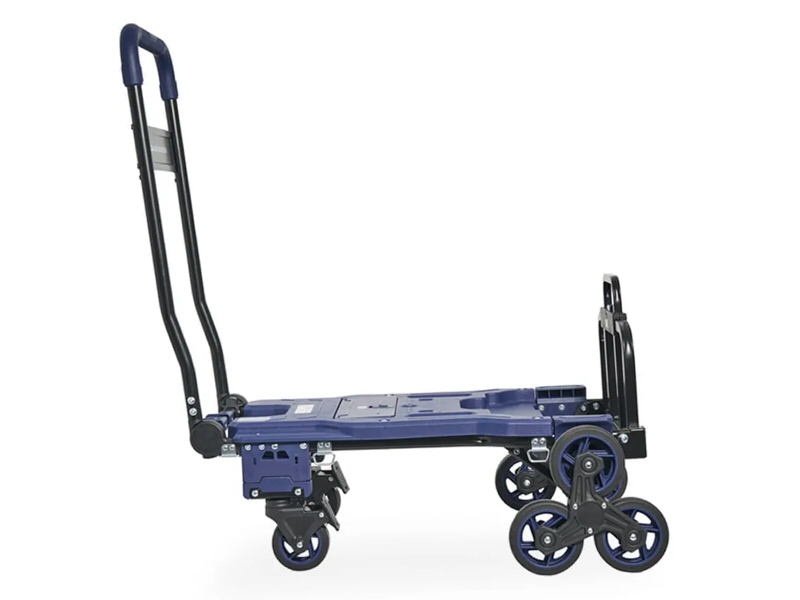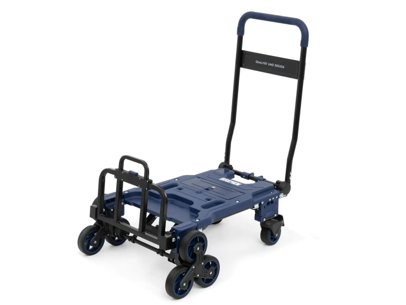 -Carro plegable de doble posición, permite trasladar cargas de diversos pesos y dimensiones, con diseño compacto en posición de guardado.
